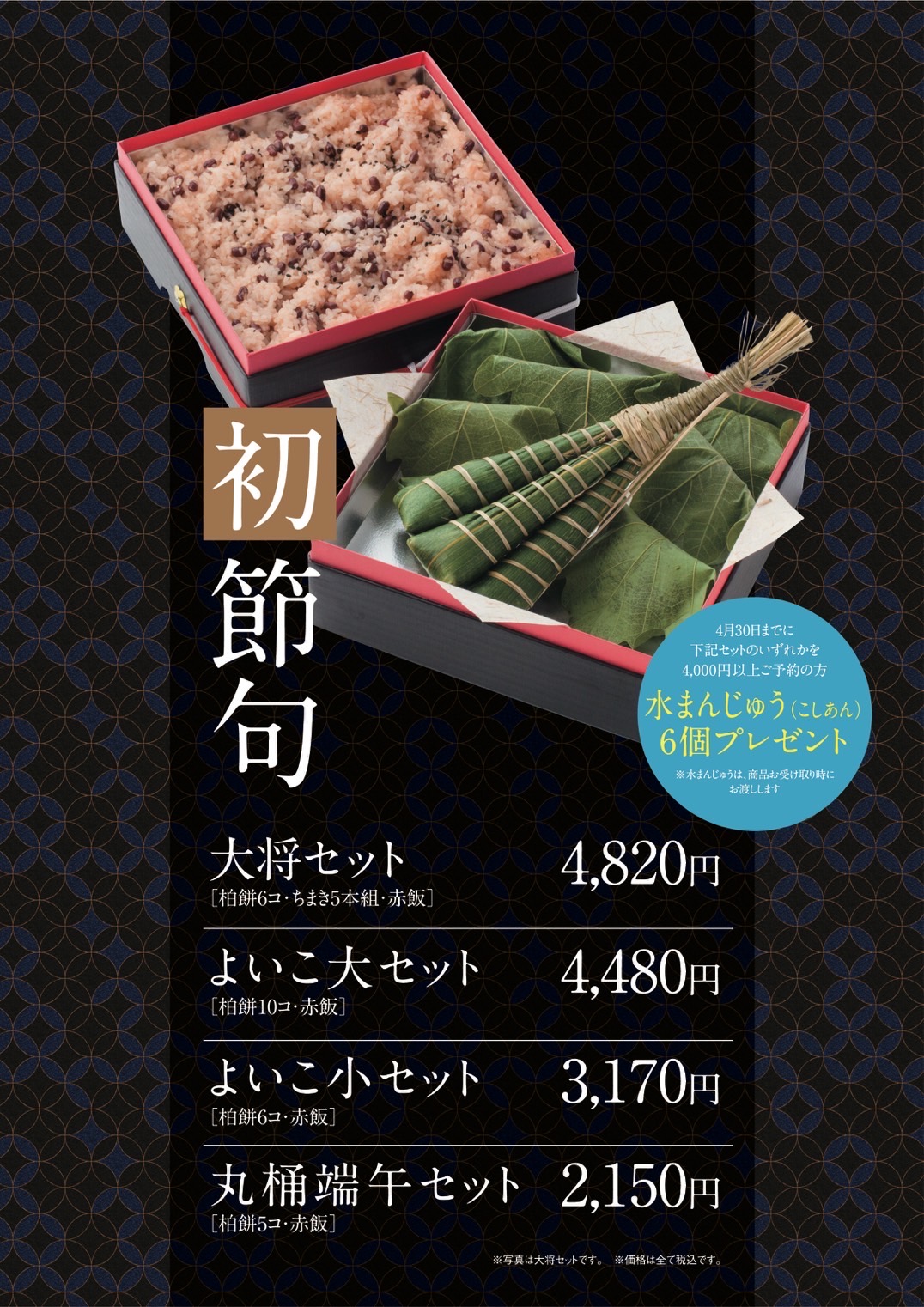 4月30日までに対象4商品のいずれかを税込4,000円以上ご予約の方に『水まんじゅう(こしあん)6個をプレゼントいたします。