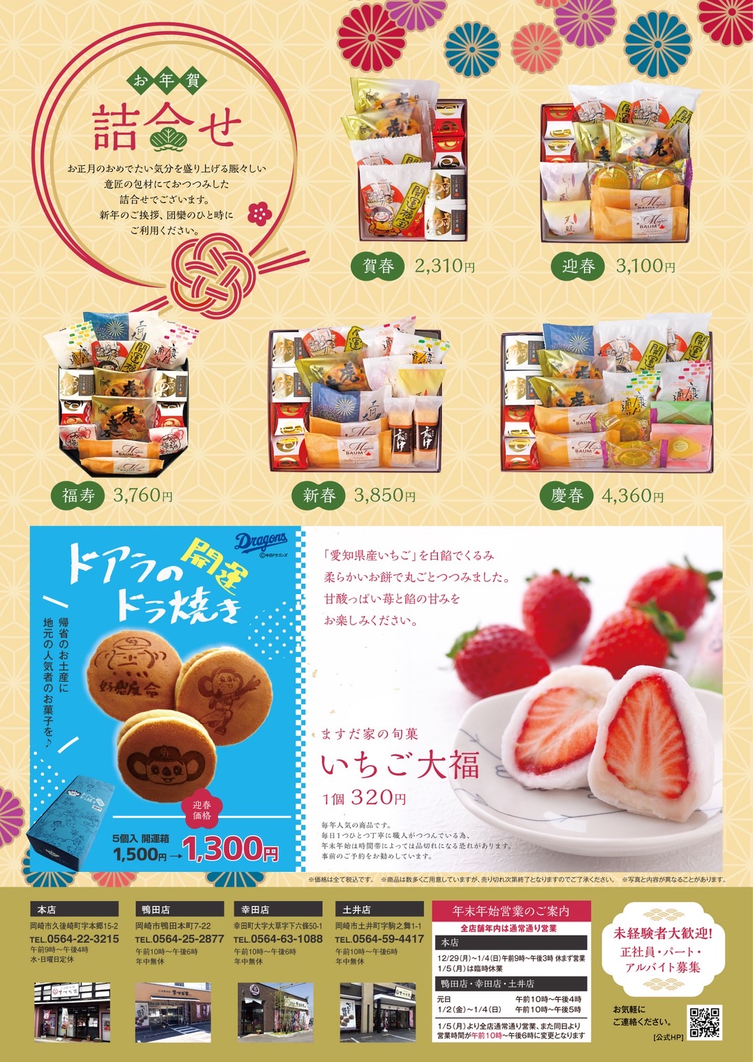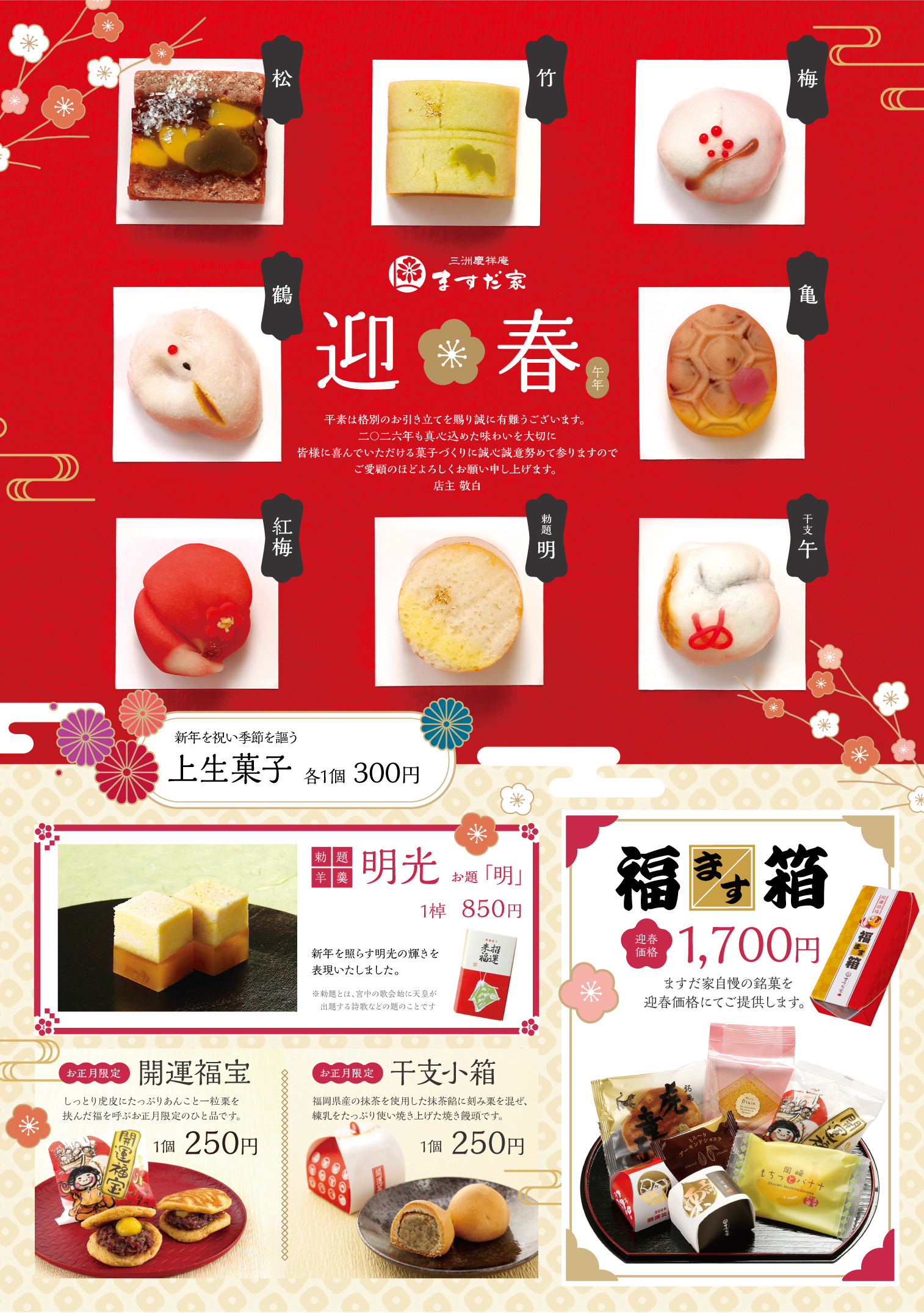 新年売り出しのお知らせ 2025年12月23日 平素は格別のお引き立てを賜り誠に有難うございます。 新たな年も真心こめた味わいを大切に皆様に喜んでいただける菓子づくりに誠心誠意努めて参りますのでご愛顧のほど宜しくお願い申し上げます。 ますだ家の自慢の銘菓を迎春価格にてご提供いたします。 なお、この広告の特別商品・価格は12月25日(木)より適用開始とさせていただきます。 ※クリックすると大きな画像でご覧になれます。